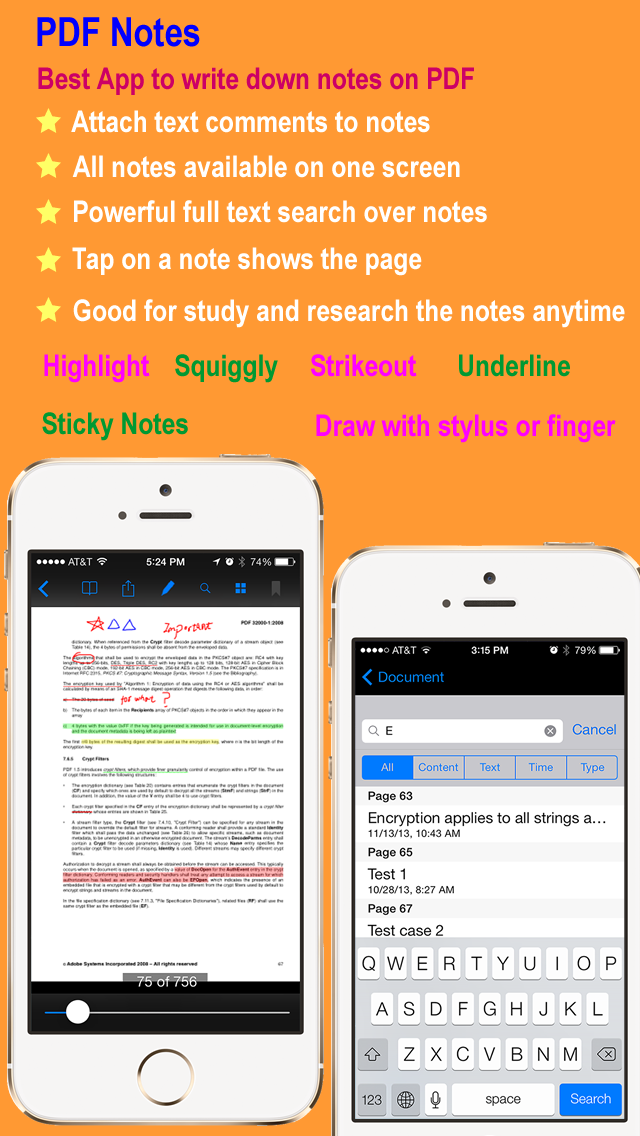 PDF Notes is a professional universal iOS PDF viewer which provides the capability to make notes on PDF documents. It gives you the ability to read, annotate, print, manage, and share your PDF files. Using PDF Notes, it is simple to take notes and browse notes, sign a PDF document, annotate PDF documents, add bookmarks, highlight text, search text over all the pages, draw anything with a touch pen or just your finger.