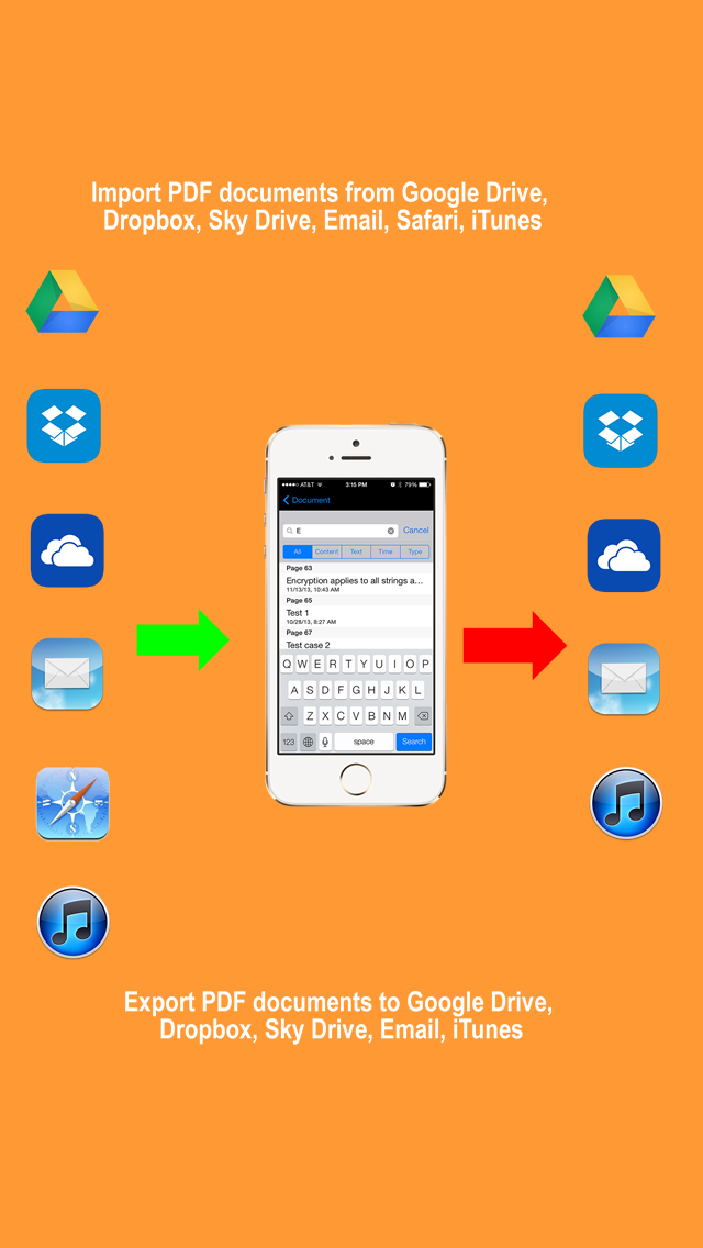 PDF Notes has a simple but powerful built-in file management system, so it is very easy to import PDF files into PDF Notes or export them from PDF Notes. For example, you can copy PDF files between your computer and PDF Notes, open PDF files from email or send them out by email, send PDF files directly to other iOS devices(made in 2013 or later only) nearby if PDF Notes is installed on iOS devices made in 2013 or later, transfer PDF files between Cloud Storages(Dropbox, GoogleDrive, Live Drive) and PDF Notes.